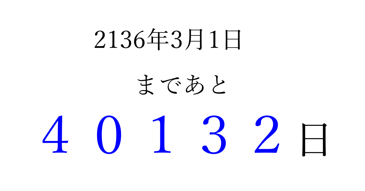 2136年3月1日(木)まで あと 99999 日です 追加すると、トップページからすぐ選べるようになります ※2026/04/15現在の結果です。 最新の状態に更新する ↓シェアして、タイムライン上にカウントダウンを表示しよう!↓ 📤 この結果を共有する Tweet シェア Threads Bluesky 別の日付でカウントダウン 2136年3月のカレンダー このページをブックマークに追加すると、いつでもカウントダウンを確認できます。 (PC: Ctrl+D / Mac: ⌘+D) hitome-notes.comでは以下のページも運営しています。 指定日と期間から日付を計算 | ガチャ確率計算・シミュレーション | プライバシー・ポリシー 運営者:Avocado