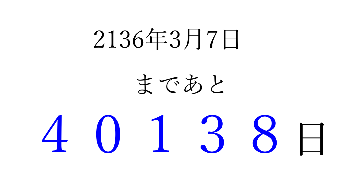 2136年3月7日(水)まで あと 99999 日です 追加すると、トップページからすぐ選べるようになります ※2026/04/15現在の結果です。 最新の状態に更新する ↓シェアして、タイムライン上にカウントダウンを表示しよう!↓ 📤 この結果を共有する Tweet シェア Threads Bluesky 別の日付でカウントダウン 2136年3月のカレンダー このページをブックマークに追加すると、いつでもカウントダウンを確認できます。 (PC: Ctrl+D / Mac: ⌘+D) hitome-notes.comでは以下のページも運営しています。 指定日と期間から日付を計算 | ガチャ確率計算・シミュレーション | プライバシー・ポリシー 運営者:Avocado