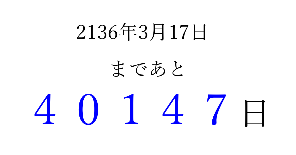 2136年3月17日(土)まで あと 99999 日です 追加すると、トップページからすぐ選べるようになります ※2026/04/16現在の結果です。 最新の状態に更新する ↓シェアして、タイムライン上にカウントダウンを表示しよう!↓ 📤 この結果を共有する Tweet シェア Threads Bluesky 別の日付でカウントダウン 2136年3月のカレンダー このページをブックマークに追加すると、いつでもカウントダウンを確認できます。 (PC: Ctrl+D / Mac: ⌘+D) hitome-notes.comでは以下のページも運営しています。 指定日と期間から日付を計算 | ガチャ確率計算・シミュレーション | プライバシー・ポリシー 運営者:Avocado