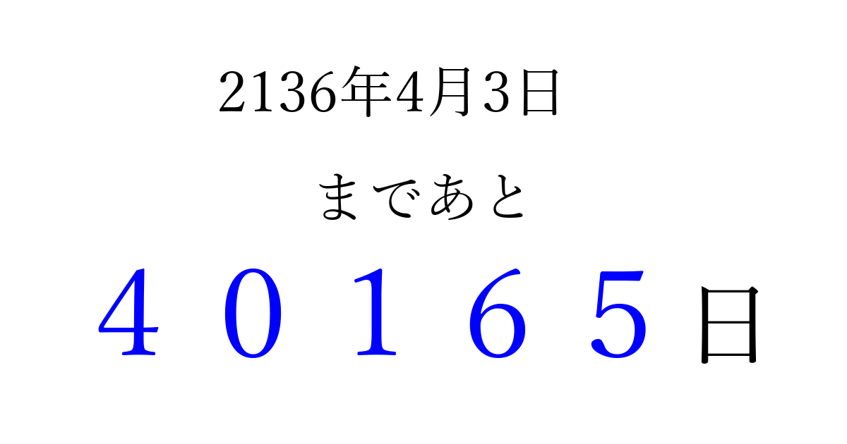2136年4月3日(火)まで あと 99999 日です 追加すると、トップページからすぐ選べるようになります ※2026/04/15現在の結果です。 最新の状態に更新する ↓シェアして、タイムライン上にカウントダウンを表示しよう!↓ 📤 この結果を共有する Tweet シェア Threads Bluesky 別の日付でカウントダウン 2136年4月のカレンダー このページをブックマークに追加すると、いつでもカウントダウンを確認できます。 (PC: Ctrl+D / Mac: ⌘+D) hitome-notes.comでは以下のページも運営しています。 指定日と期間から日付を計算 | ガチャ確率計算・シミュレーション | プライバシー・ポリシー 運営者:Avocado
