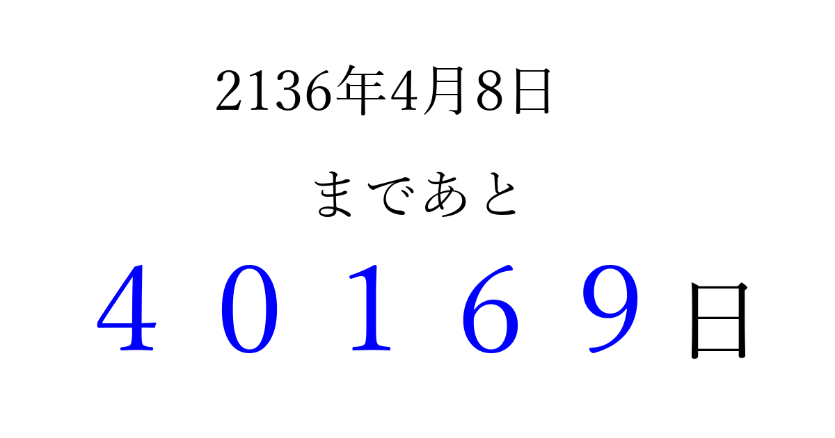 2136年4月8日(日)まで あと 99999 日です 追加すると、トップページからすぐ選べるようになります ※2026/04/16現在の結果です。 最新の状態に更新する ↓シェアして、タイムライン上にカウントダウンを表示しよう!↓ 📤 この結果を共有する Tweet シェア Threads Bluesky 別の日付でカウントダウン 2136年4月のカレンダー このページをブックマークに追加すると、いつでもカウントダウンを確認できます。 (PC: Ctrl+D / Mac: ⌘+D) hitome-notes.comでは以下のページも運営しています。 指定日と期間から日付を計算 | ガチャ確率計算・シミュレーション | プライバシー・ポリシー 運営者:Avocado