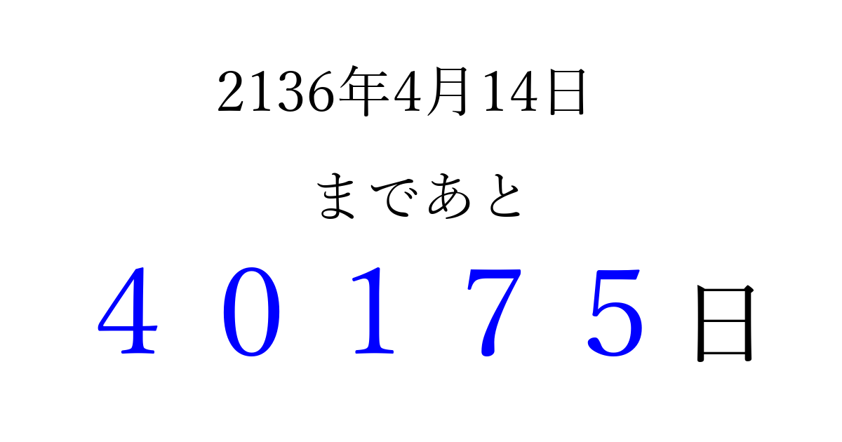 2136年4月14日(土)まで あと 99999 日です 追加すると、トップページからすぐ選べるようになります ※2026/04/16現在の結果です。 最新の状態に更新する ↓シェアして、タイムライン上にカウントダウンを表示しよう!↓ 📤 この結果を共有する Tweet シェア Threads Bluesky 別の日付でカウントダウン 2136年4月のカレンダー このページをブックマークに追加すると、いつでもカウントダウンを確認できます。 (PC: Ctrl+D / Mac: ⌘+D) hitome-notes.comでは以下のページも運営しています。 指定日と期間から日付を計算 | ガチャ確率計算・シミュレーション | プライバシー・ポリシー 運営者:Avocado