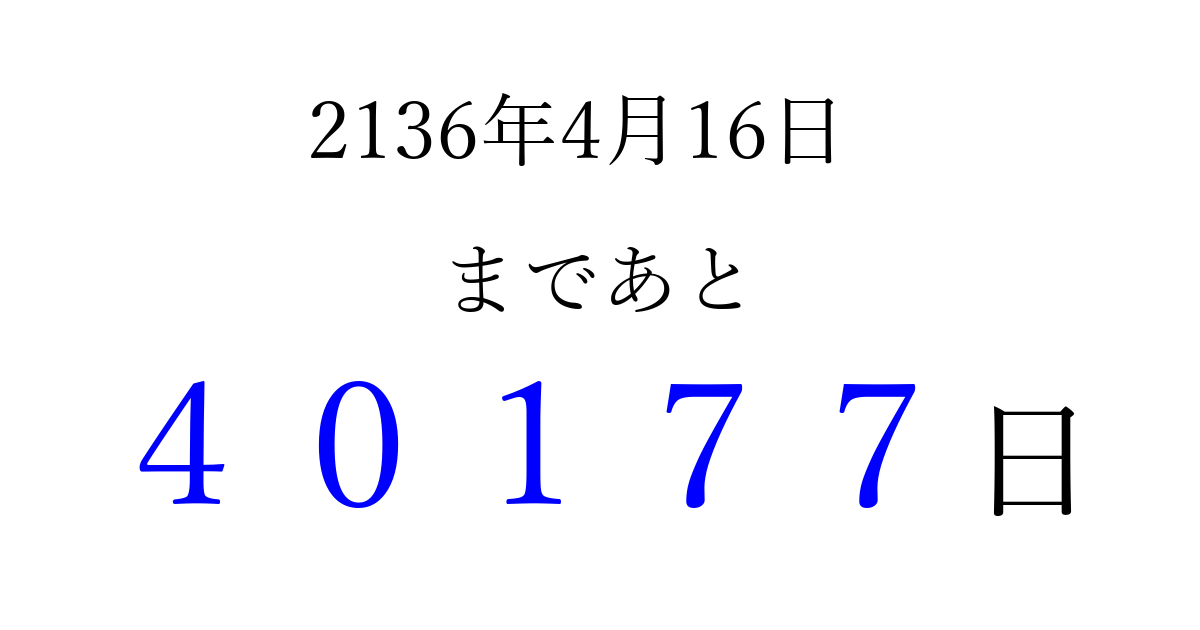 2136年4月16日(月)まで あと 99999 日です 追加すると、トップページからすぐ選べるようになります ※2026/04/16現在の結果です。 最新の状態に更新する ↓シェアして、タイムライン上にカウントダウンを表示しよう!↓ 📤 この結果を共有する Tweet シェア Threads Bluesky 別の日付でカウントダウン 2136年4月のカレンダー このページをブックマークに追加すると、いつでもカウントダウンを確認できます。 (PC: Ctrl+D / Mac: ⌘+D) hitome-notes.comでは以下のページも運営しています。 指定日と期間から日付を計算 | ガチャ確率計算・シミュレーション | プライバシー・ポリシー 運営者:Avocado