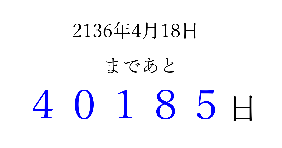 2136年4月18日(水)まで あと 99999 日です 追加すると、トップページからすぐ選べるようになります ※2026/04/10現在の結果です。 最新の状態に更新する ↓シェアして、タイムライン上にカウントダウンを表示しよう!↓ 📤 この結果を共有する Tweet シェア Threads Bluesky 別の日付でカウントダウン 2136年4月のカレンダー このページをブックマークに追加すると、いつでもカウントダウンを確認できます。 (PC: Ctrl+D / Mac: ⌘+D) hitome-notes.comでは以下のページも運営しています。 指定日と期間から日付を計算 | ガチャ確率計算・シミュレーション | プライバシー・ポリシー 運営者:Avocado