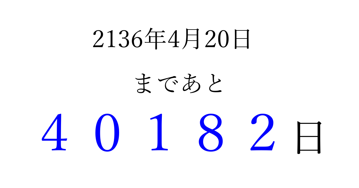 2136年4月20日(金)まで あと 99999 日です 追加すると、トップページからすぐ選べるようになります ※2026/04/15現在の結果です。 最新の状態に更新する ↓シェアして、タイムライン上にカウントダウンを表示しよう!↓ 📤 この結果を共有する Tweet シェア Threads Bluesky 別の日付でカウントダウン 2136年4月のカレンダー このページをブックマークに追加すると、いつでもカウントダウンを確認できます。 (PC: Ctrl+D / Mac: ⌘+D) hitome-notes.comでは以下のページも運営しています。 指定日と期間から日付を計算 | ガチャ確率計算・シミュレーション | プライバシー・ポリシー 運営者:Avocado