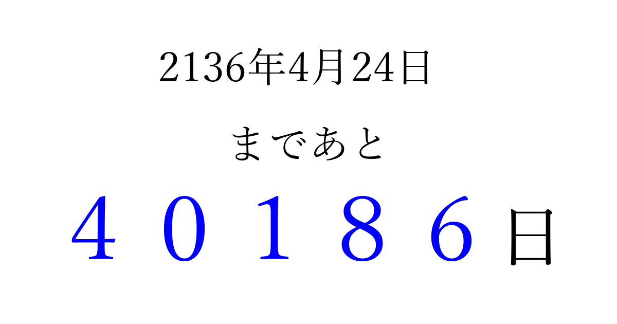 2136年4月24日(火)まで あと 99999 日です 追加すると、トップページからすぐ選べるようになります ※2026/04/15現在の結果です。 最新の状態に更新する ↓シェアして、タイムライン上にカウントダウンを表示しよう!↓ 📤 この結果を共有する Tweet シェア Threads Bluesky 別の日付でカウントダウン 2136年4月のカレンダー このページをブックマークに追加すると、いつでもカウントダウンを確認できます。 (PC: Ctrl+D / Mac: ⌘+D) hitome-notes.comでは以下のページも運営しています。 指定日と期間から日付を計算 | ガチャ確率計算・シミュレーション | プライバシー・ポリシー 運営者:Avocado