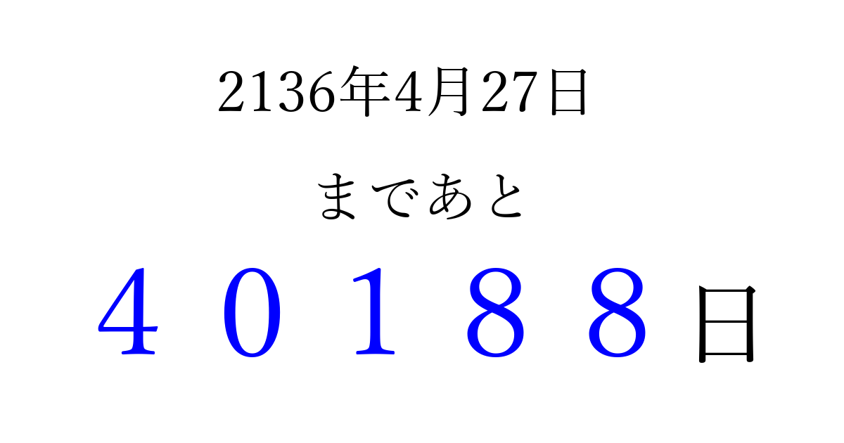 2136年4月27日(金)まで あと 99999 日です 追加すると、トップページからすぐ選べるようになります ※2026/04/16現在の結果です。 最新の状態に更新する ↓シェアして、タイムライン上にカウントダウンを表示しよう!↓ 📤 この結果を共有する Tweet シェア Threads Bluesky 別の日付でカウントダウン 2136年4月のカレンダー このページをブックマークに追加すると、いつでもカウントダウンを確認できます。 (PC: Ctrl+D / Mac: ⌘+D) hitome-notes.comでは以下のページも運営しています。 指定日と期間から日付を計算 | ガチャ確率計算・シミュレーション | プライバシー・ポリシー 運営者:Avocado