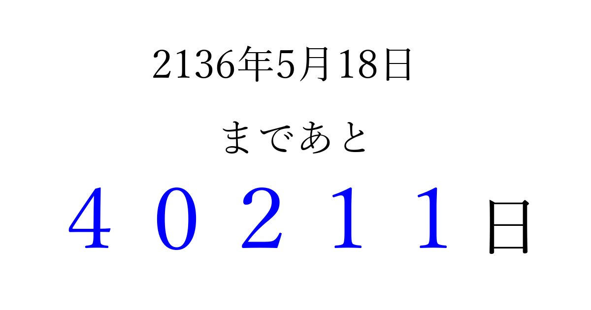 2136年5月18日(金)まで あと 99999 日です 追加すると、トップページからすぐ選べるようになります ※2026/04/14現在の結果です。 最新の状態に更新する ↓シェアして、タイムライン上にカウントダウンを表示しよう!↓ 📤 この結果を共有する Tweet シェア Threads Bluesky 別の日付でカウントダウン 2136年5月のカレンダー このページをブックマークに追加すると、いつでもカウントダウンを確認できます。 (PC: Ctrl+D / Mac: ⌘+D) hitome-notes.comでは以下のページも運営しています。 指定日と期間から日付を計算 | ガチャ確率計算・シミュレーション | プライバシー・ポリシー 運営者:Avocado