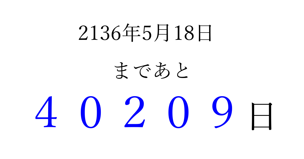 2136年5月18日(金)まで あと 99999 日です 追加すると、トップページからすぐ選べるようになります ※2026/04/16現在の結果です。 最新の状態に更新する ↓シェアして、タイムライン上にカウントダウンを表示しよう!↓ 📤 この結果を共有する Tweet シェア Threads Bluesky 別の日付でカウントダウン 2136年5月のカレンダー このページをブックマークに追加すると、いつでもカウントダウンを確認できます。 (PC: Ctrl+D / Mac: ⌘+D) hitome-notes.comでは以下のページも運営しています。 指定日と期間から日付を計算 | ガチャ確率計算・シミュレーション | プライバシー・ポリシー 運営者:Avocado