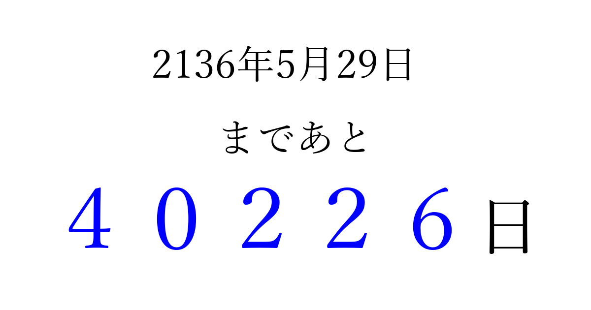 2136年5月29日(火)まで あと 99999 日です 追加すると、トップページからすぐ選べるようになります ※2026/04/10現在の結果です。 最新の状態に更新する ↓シェアして、タイムライン上にカウントダウンを表示しよう!↓ 📤 この結果を共有する Tweet シェア Threads Bluesky 別の日付でカウントダウン 2136年5月のカレンダー このページをブックマークに追加すると、いつでもカウントダウンを確認できます。 (PC: Ctrl+D / Mac: ⌘+D) hitome-notes.comでは以下のページも運営しています。 指定日と期間から日付を計算 | ガチャ確率計算・シミュレーション | プライバシー・ポリシー 運営者:Avocado
