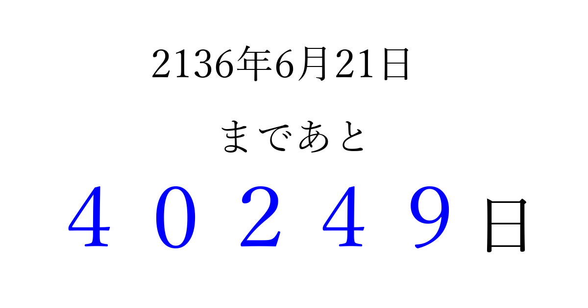 2136年6月21日(木)まで あと 99999 日です 追加すると、トップページからすぐ選べるようになります ※2026/04/10現在の結果です。 最新の状態に更新する ↓シェアして、タイムライン上にカウントダウンを表示しよう!↓ 📤 この結果を共有する Tweet シェア Threads Bluesky 別の日付でカウントダウン 2136年6月のカレンダー このページをブックマークに追加すると、いつでもカウントダウンを確認できます。 (PC: Ctrl+D / Mac: ⌘+D) hitome-notes.comでは以下のページも運営しています。 指定日と期間から日付を計算 | ガチャ確率計算・シミュレーション | プライバシー・ポリシー 運営者:Avocado