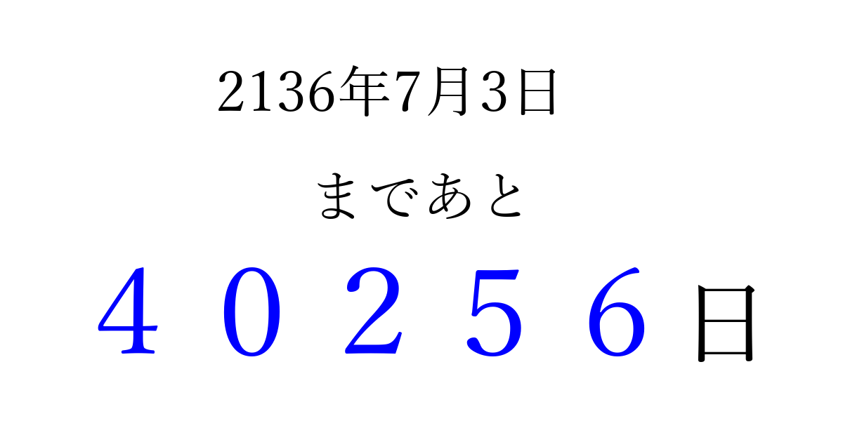2136年7月3日(火)まで あと 99999 日です 追加すると、トップページからすぐ選べるようになります ※2026/04/15現在の結果です。 最新の状態に更新する ↓シェアして、タイムライン上にカウントダウンを表示しよう!↓ 📤 この結果を共有する Tweet シェア Threads Bluesky 別の日付でカウントダウン 2136年7月のカレンダー このページをブックマークに追加すると、いつでもカウントダウンを確認できます。 (PC: Ctrl+D / Mac: ⌘+D) hitome-notes.comでは以下のページも運営しています。 指定日と期間から日付を計算 | ガチャ確率計算・シミュレーション | プライバシー・ポリシー 運営者:Avocado