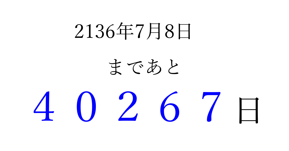 2136年7月8日(日)まで あと 99999 日です 追加すると、トップページからすぐ選べるようになります ※2026/04/09現在の結果です。 最新の状態に更新する ↓シェアして、タイムライン上にカウントダウンを表示しよう!↓ 📤 この結果を共有する Tweet シェア Threads Bluesky 別の日付でカウントダウン 2136年7月のカレンダー このページをブックマークに追加すると、いつでもカウントダウンを確認できます。 (PC: Ctrl+D / Mac: ⌘+D) hitome-notes.comでは以下のページも運営しています。 指定日と期間から日付を計算 | ガチャ確率計算・シミュレーション | プライバシー・ポリシー 運営者:Avocado