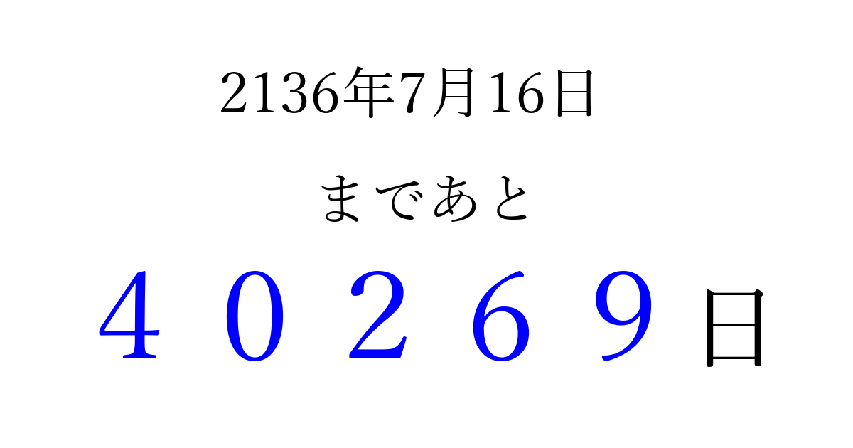 2136年7月16日(月)まで あと 99999 日です 追加すると、トップページからすぐ選べるようになります ※2026/04/15現在の結果です。 最新の状態に更新する ↓シェアして、タイムライン上にカウントダウンを表示しよう!↓ 📤 この結果を共有する Tweet シェア Threads Bluesky 別の日付でカウントダウン 2136年7月のカレンダー このページをブックマークに追加すると、いつでもカウントダウンを確認できます。 (PC: Ctrl+D / Mac: ⌘+D) hitome-notes.comでは以下のページも運営しています。 指定日と期間から日付を計算 | ガチャ確率計算・シミュレーション | プライバシー・ポリシー 運営者:Avocado