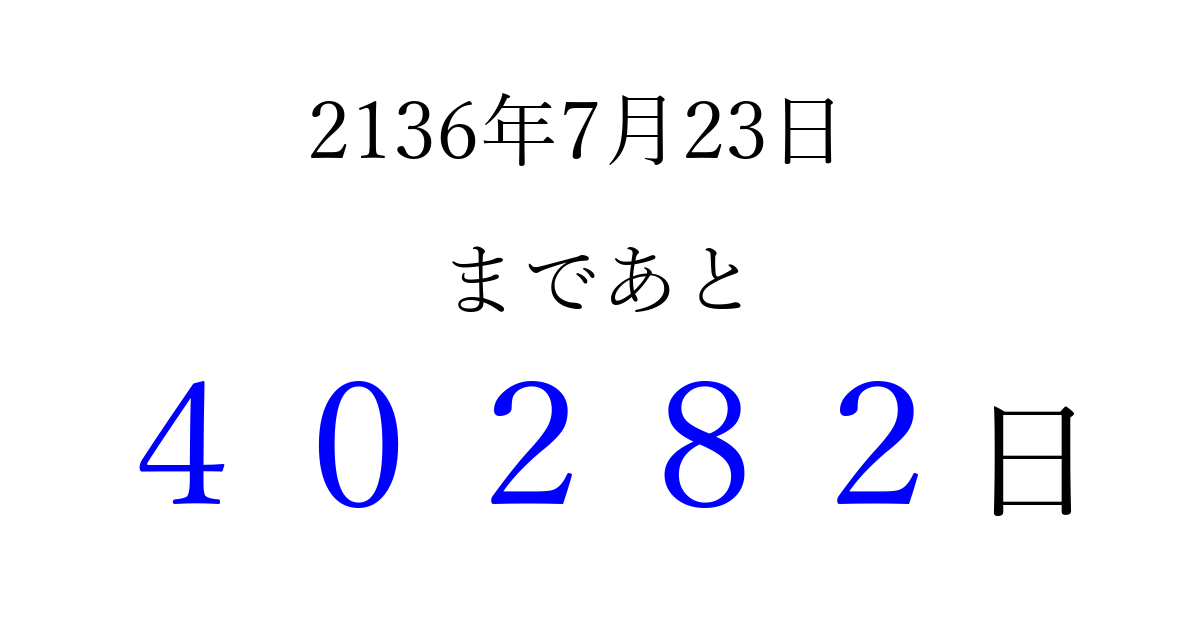 2136年7月23日(月)まで あと 99999 日です 追加すると、トップページからすぐ選べるようになります ※2026/04/09現在の結果です。 最新の状態に更新する ↓シェアして、タイムライン上にカウントダウンを表示しよう!↓ 📤 この結果を共有する Tweet シェア Threads Bluesky 別の日付でカウントダウン 2136年7月のカレンダー このページをブックマークに追加すると、いつでもカウントダウンを確認できます。 (PC: Ctrl+D / Mac: ⌘+D) hitome-notes.comでは以下のページも運営しています。 指定日と期間から日付を計算 | ガチャ確率計算・シミュレーション | プライバシー・ポリシー 運営者:Avocado