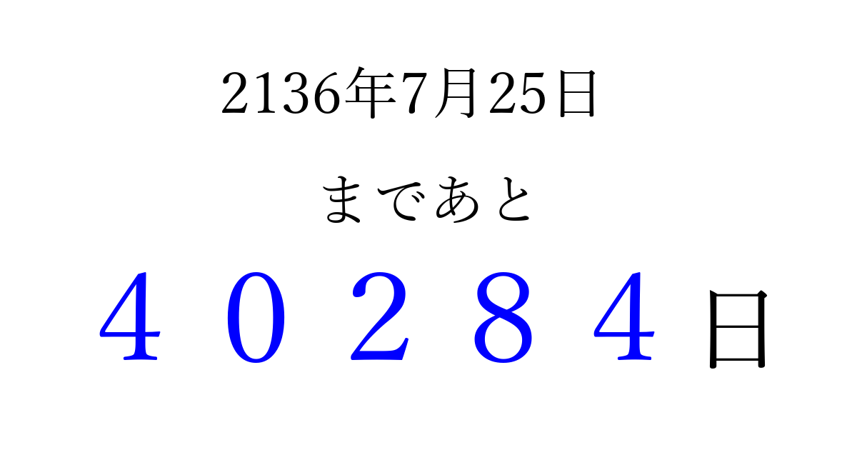 2136年7月25日(水)まで あと 99999 日です 追加すると、トップページからすぐ選べるようになります ※2026/04/09現在の結果です。 最新の状態に更新する ↓シェアして、タイムライン上にカウントダウンを表示しよう!↓ 📤 この結果を共有する Tweet シェア Threads Bluesky 別の日付でカウントダウン 2136年7月のカレンダー このページをブックマークに追加すると、いつでもカウントダウンを確認できます。 (PC: Ctrl+D / Mac: ⌘+D) hitome-notes.comでは以下のページも運営しています。 指定日と期間から日付を計算 | ガチャ確率計算・シミュレーション | プライバシー・ポリシー 運営者:Avocado