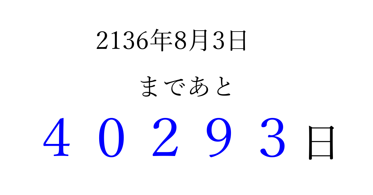 2136年8月3日(金)まで あと 99999 日です 追加すると、トップページからすぐ選べるようになります ※2026/04/09現在の結果です。 最新の状態に更新する ↓シェアして、タイムライン上にカウントダウンを表示しよう!↓ 📤 この結果を共有する Tweet シェア Threads Bluesky 別の日付でカウントダウン 2136年8月のカレンダー このページをブックマークに追加すると、いつでもカウントダウンを確認できます。 (PC: Ctrl+D / Mac: ⌘+D) hitome-notes.comでは以下のページも運営しています。 指定日と期間から日付を計算 | ガチャ確率計算・シミュレーション | プライバシー・ポリシー 運営者:Avocado