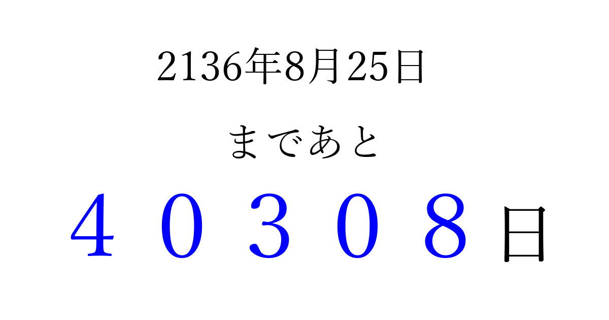2136年8月25日(土)まで あと 99999 日です 追加すると、トップページからすぐ選べるようになります ※2026/04/16現在の結果です。 最新の状態に更新する ↓シェアして、タイムライン上にカウントダウンを表示しよう!↓ 📤 この結果を共有する Tweet シェア Threads Bluesky 別の日付でカウントダウン 2136年8月のカレンダー このページをブックマークに追加すると、いつでもカウントダウンを確認できます。 (PC: Ctrl+D / Mac: ⌘+D) hitome-notes.comでは以下のページも運営しています。 指定日と期間から日付を計算 | ガチャ確率計算・シミュレーション | プライバシー・ポリシー 運営者:Avocado
