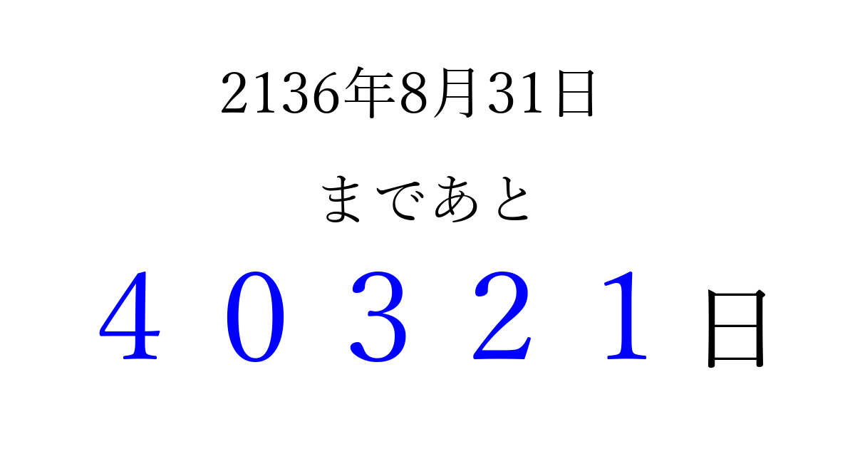 2136年8月31日(金)まで あと 99999 日です 追加すると、トップページからすぐ選べるようになります ※2026/04/09現在の結果です。 最新の状態に更新する ↓シェアして、タイムライン上にカウントダウンを表示しよう!↓ 📤 この結果を共有する Tweet シェア Threads Bluesky 別の日付でカウントダウン 2136年8月のカレンダー このページをブックマークに追加すると、いつでもカウントダウンを確認できます。 (PC: Ctrl+D / Mac: ⌘+D) hitome-notes.comでは以下のページも運営しています。 指定日と期間から日付を計算 | ガチャ確率計算・シミュレーション | プライバシー・ポリシー 運営者:Avocado