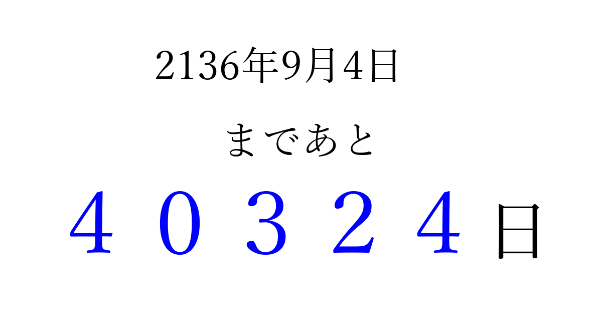 2136年9月4日(火)まで あと 99999 日です 追加すると、トップページからすぐ選べるようになります ※2026/04/10現在の結果です。 最新の状態に更新する ↓シェアして、タイムライン上にカウントダウンを表示しよう!↓ 📤 この結果を共有する Tweet シェア Threads Bluesky 別の日付でカウントダウン 2136年9月のカレンダー このページをブックマークに追加すると、いつでもカウントダウンを確認できます。 (PC: Ctrl+D / Mac: ⌘+D) hitome-notes.comでは以下のページも運営しています。 指定日と期間から日付を計算 | ガチャ確率計算・シミュレーション | プライバシー・ポリシー 運営者:Avocado