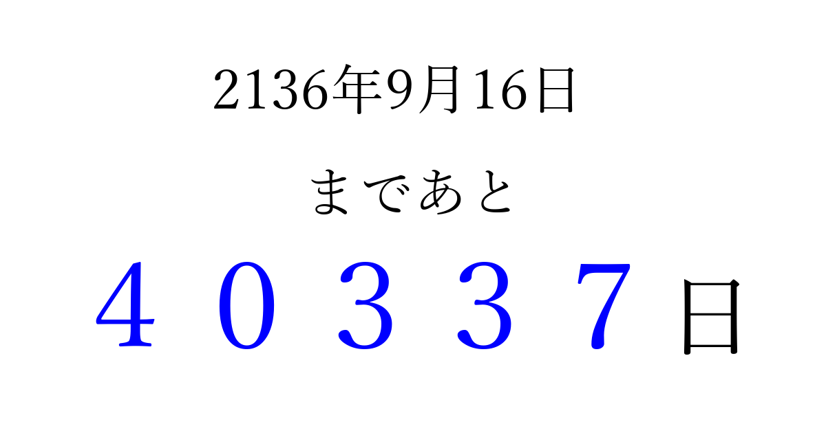 2136年9月16日(日)まで あと 99999 日です 追加すると、トップページからすぐ選べるようになります ※2026/04/09現在の結果です。 最新の状態に更新する ↓シェアして、タイムライン上にカウントダウンを表示しよう!↓ 📤 この結果を共有する Tweet シェア Threads Bluesky 別の日付でカウントダウン 2136年9月のカレンダー このページをブックマークに追加すると、いつでもカウントダウンを確認できます。 (PC: Ctrl+D / Mac: ⌘+D) hitome-notes.comでは以下のページも運営しています。 指定日と期間から日付を計算 | ガチャ確率計算・シミュレーション | プライバシー・ポリシー 運営者:Avocado