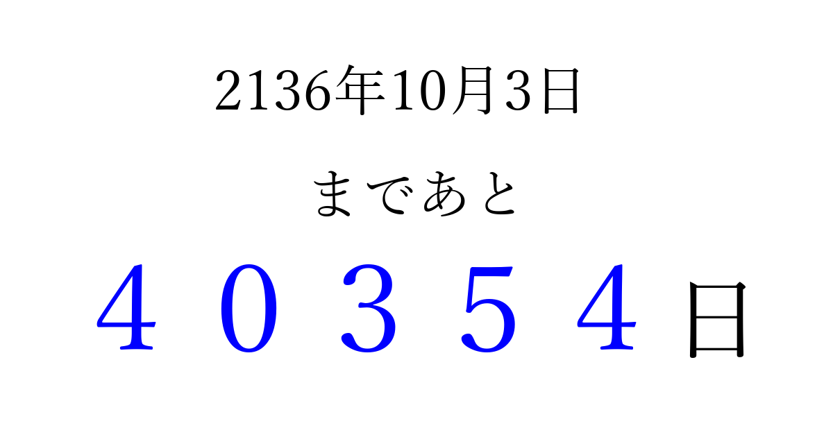 2136年10月3日(水)まで あと 99999 日です 追加すると、トップページからすぐ選べるようになります ※2026/04/09現在の結果です。 最新の状態に更新する ↓シェアして、タイムライン上にカウントダウンを表示しよう!↓ 📤 この結果を共有する Tweet シェア Threads Bluesky 別の日付でカウントダウン 2136年10月のカレンダー このページをブックマークに追加すると、いつでもカウントダウンを確認できます。 (PC: Ctrl+D / Mac: ⌘+D) hitome-notes.comでは以下のページも運営しています。 指定日と期間から日付を計算 | ガチャ確率計算・シミュレーション | プライバシー・ポリシー 運営者:Avocado