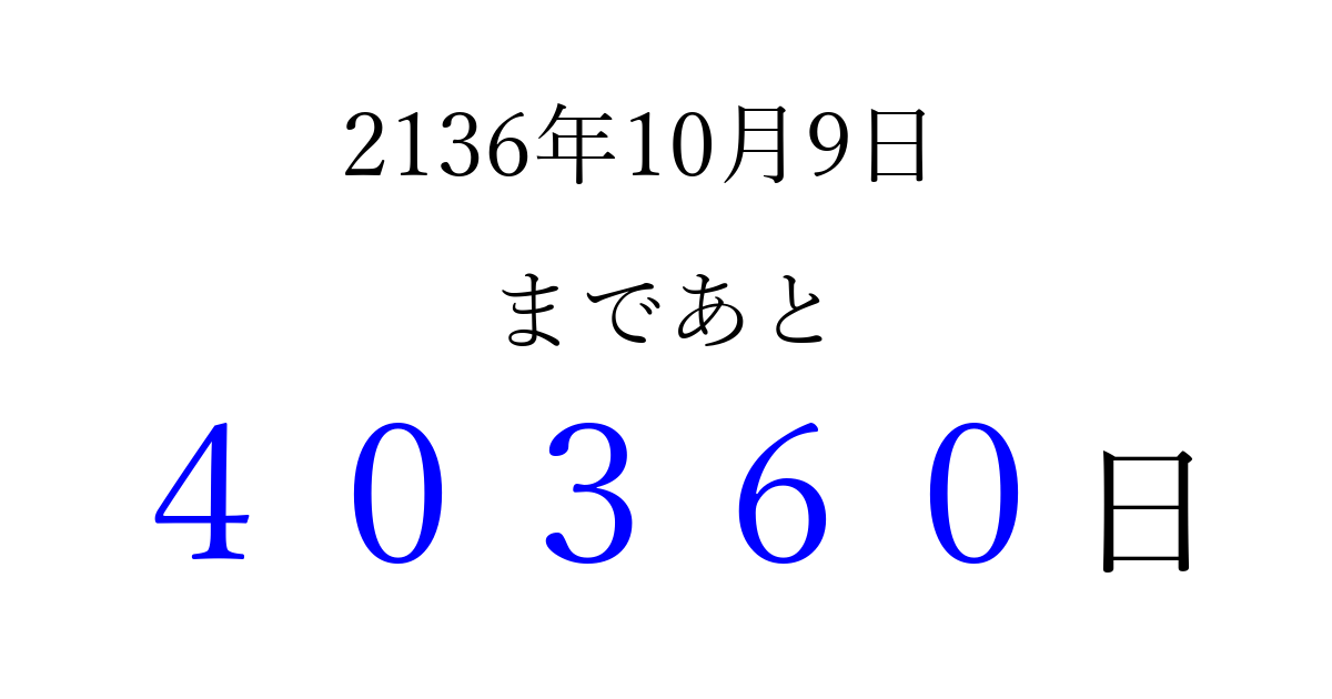 2136年10月9日(火)まで あと 99999 日です 追加すると、トップページからすぐ選べるようになります ※2026/04/09現在の結果です。 最新の状態に更新する ↓シェアして、タイムライン上にカウントダウンを表示しよう!↓ 📤 この結果を共有する Tweet シェア Threads Bluesky 別の日付でカウントダウン 2136年10月のカレンダー このページをブックマークに追加すると、いつでもカウントダウンを確認できます。 (PC: Ctrl+D / Mac: ⌘+D) hitome-notes.comでは以下のページも運営しています。 指定日と期間から日付を計算 | ガチャ確率計算・シミュレーション | プライバシー・ポリシー 運営者:Avocado