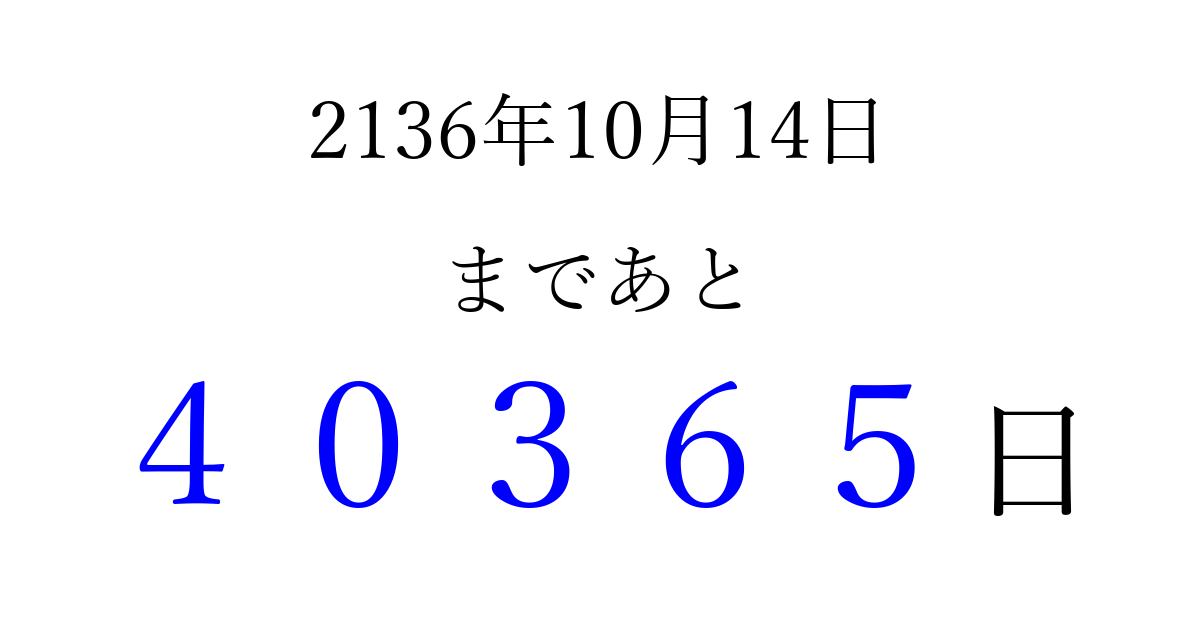 2136年10月14日(日)まで あと 99999 日です 追加すると、トップページからすぐ選べるようになります ※2026/04/09現在の結果です。 最新の状態に更新する ↓シェアして、タイムライン上にカウントダウンを表示しよう!↓ 📤 この結果を共有する Tweet シェア Threads Bluesky 別の日付でカウントダウン 2136年10月のカレンダー このページをブックマークに追加すると、いつでもカウントダウンを確認できます。 (PC: Ctrl+D / Mac: ⌘+D) hitome-notes.comでは以下のページも運営しています。 指定日と期間から日付を計算 | ガチャ確率計算・シミュレーション | プライバシー・ポリシー 運営者:Avocado