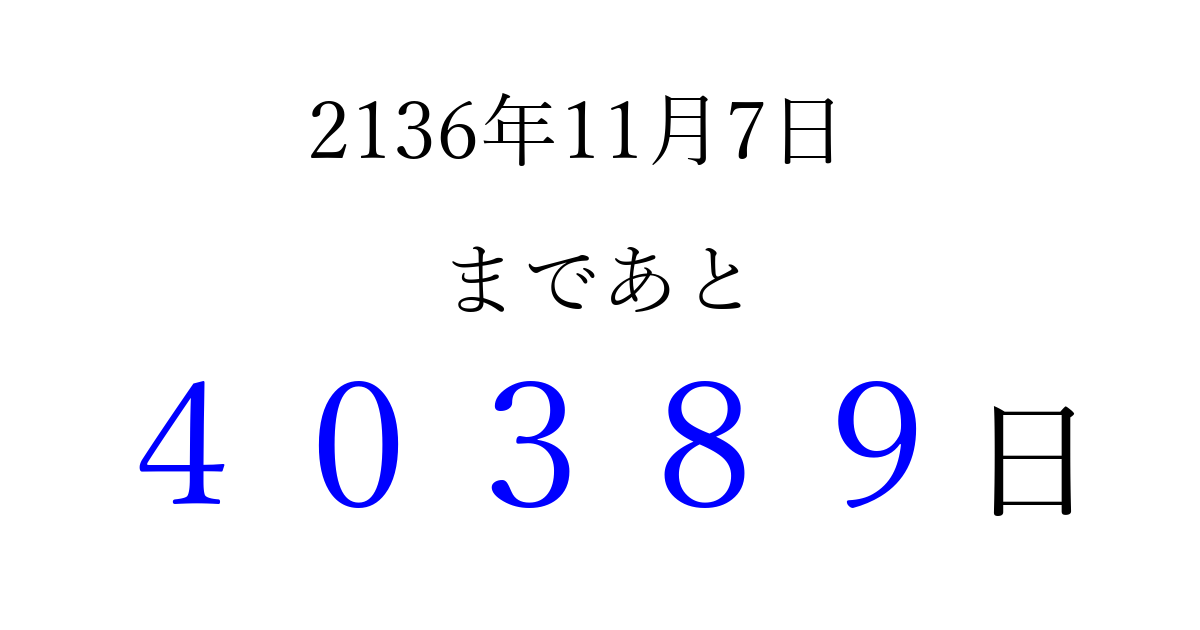 2136年11月7日(水)まで あと 99999 日です 追加すると、トップページからすぐ選べるようになります ※2026/04/09現在の結果です。 最新の状態に更新する ↓シェアして、タイムライン上にカウントダウンを表示しよう!↓ 📤 この結果を共有する Tweet シェア Threads Bluesky 別の日付でカウントダウン 2136年11月のカレンダー このページをブックマークに追加すると、いつでもカウントダウンを確認できます。 (PC: Ctrl+D / Mac: ⌘+D) hitome-notes.comでは以下のページも運営しています。 指定日と期間から日付を計算 | ガチャ確率計算・シミュレーション | プライバシー・ポリシー 運営者:Avocado