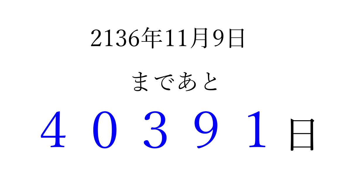 2136年11月9日(金)まで あと 99999 日です 追加すると、トップページからすぐ選べるようになります ※2026/04/09現在の結果です。 最新の状態に更新する ↓シェアして、タイムライン上にカウントダウンを表示しよう!↓ 📤 この結果を共有する Tweet シェア Threads Bluesky 別の日付でカウントダウン 2136年11月のカレンダー このページをブックマークに追加すると、いつでもカウントダウンを確認できます。 (PC: Ctrl+D / Mac: ⌘+D) hitome-notes.comでは以下のページも運営しています。 指定日と期間から日付を計算 | ガチャ確率計算・シミュレーション | プライバシー・ポリシー 運営者:Avocado