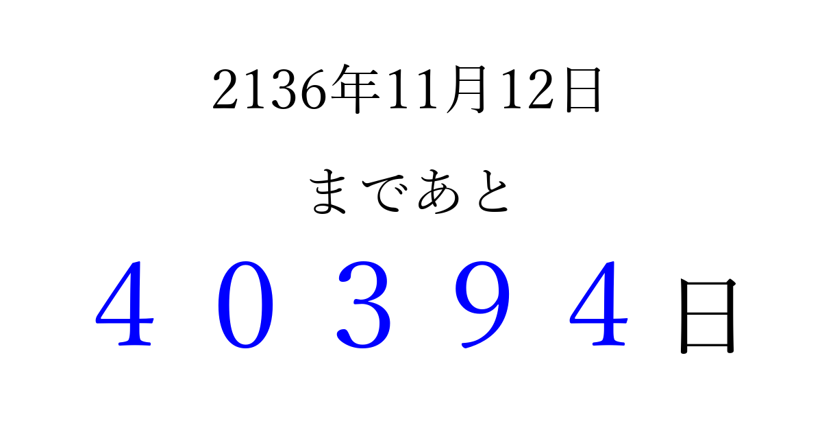 2136年11月12日(月)まで あと 99999 日です 追加すると、トップページからすぐ選べるようになります ※2026/04/09現在の結果です。 最新の状態に更新する ↓シェアして、タイムライン上にカウントダウンを表示しよう!↓ 📤 この結果を共有する Tweet シェア Threads Bluesky 別の日付でカウントダウン 2136年11月のカレンダー このページをブックマークに追加すると、いつでもカウントダウンを確認できます。 (PC: Ctrl+D / Mac: ⌘+D) hitome-notes.comでは以下のページも運営しています。 指定日と期間から日付を計算 | ガチャ確率計算・シミュレーション | プライバシー・ポリシー 運営者:Avocado