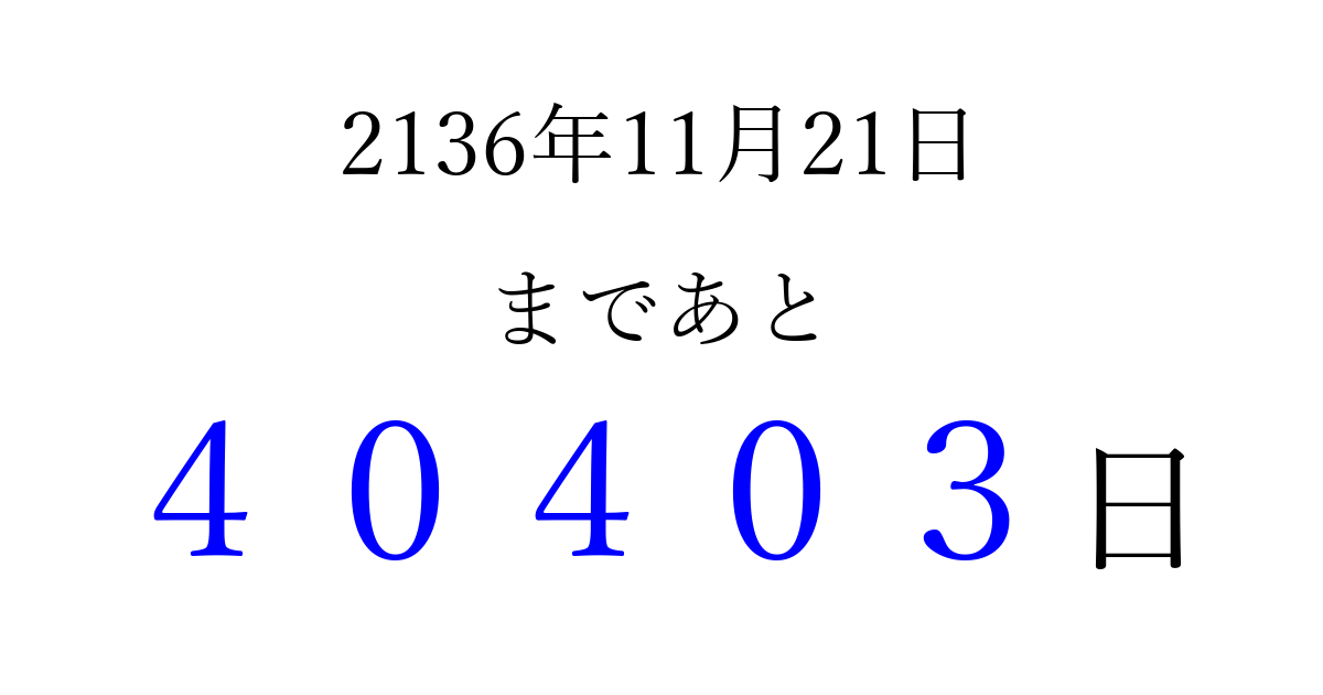 2136年11月21日(水)まで あと 99999 日です 追加すると、トップページからすぐ選べるようになります ※2026/04/09現在の結果です。 最新の状態に更新する ↓シェアして、タイムライン上にカウントダウンを表示しよう!↓ 📤 この結果を共有する Tweet シェア Threads Bluesky 別の日付でカウントダウン 2136年11月のカレンダー このページをブックマークに追加すると、いつでもカウントダウンを確認できます。 (PC: Ctrl+D / Mac: ⌘+D) hitome-notes.comでは以下のページも運営しています。 指定日と期間から日付を計算 | ガチャ確率計算・シミュレーション | プライバシー・ポリシー 運営者:Avocado