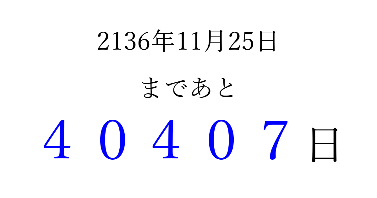 2136年11月25日(日)まで あと 99999 日です 追加すると、トップページからすぐ選べるようになります ※2026/04/09現在の結果です。 最新の状態に更新する ↓シェアして、タイムライン上にカウントダウンを表示しよう!↓ 📤 この結果を共有する Tweet シェア Threads Bluesky 別の日付でカウントダウン 2136年11月のカレンダー このページをブックマークに追加すると、いつでもカウントダウンを確認できます。 (PC: Ctrl+D / Mac: ⌘+D) hitome-notes.comでは以下のページも運営しています。 指定日と期間から日付を計算 | ガチャ確率計算・シミュレーション | プライバシー・ポリシー 運営者:Avocado
