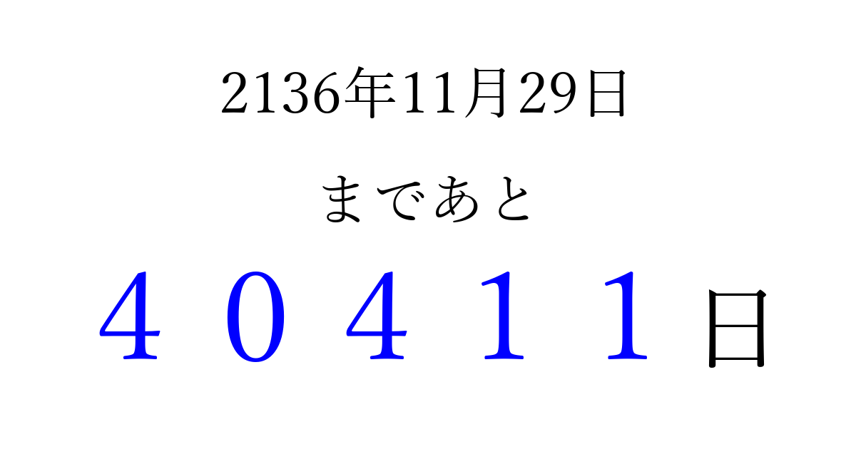 2136年11月29日(木)まで あと 99999 日です 追加すると、トップページからすぐ選べるようになります ※2026/04/09現在の結果です。 最新の状態に更新する ↓シェアして、タイムライン上にカウントダウンを表示しよう!↓ 📤 この結果を共有する Tweet シェア Threads Bluesky 別の日付でカウントダウン 2136年11月のカレンダー このページをブックマークに追加すると、いつでもカウントダウンを確認できます。 (PC: Ctrl+D / Mac: ⌘+D) hitome-notes.comでは以下のページも運営しています。 指定日と期間から日付を計算 | ガチャ確率計算・シミュレーション | プライバシー・ポリシー 運営者:Avocado