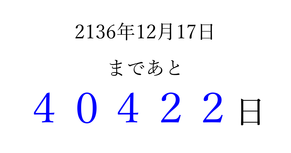 2136年12月17日(月)まで あと 99999 日です 追加すると、トップページからすぐ選べるようになります ※2026/04/16現在の結果です。 最新の状態に更新する ↓シェアして、タイムライン上にカウントダウンを表示しよう!↓ 📤 この結果を共有する Tweet シェア Threads Bluesky 別の日付でカウントダウン 2136年12月のカレンダー このページをブックマークに追加すると、いつでもカウントダウンを確認できます。 (PC: Ctrl+D / Mac: ⌘+D) hitome-notes.comでは以下のページも運営しています。 指定日と期間から日付を計算 | ガチャ確率計算・シミュレーション | プライバシー・ポリシー 運営者:Avocado