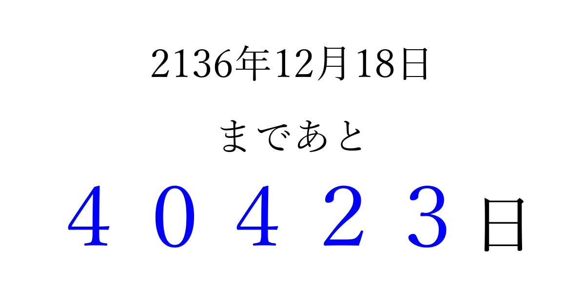 2136年12月18日(火)まで あと 99999 日です 追加すると、トップページからすぐ選べるようになります ※2026/04/16現在の結果です。 最新の状態に更新する ↓シェアして、タイムライン上にカウントダウンを表示しよう!↓ 📤 この結果を共有する Tweet シェア Threads Bluesky 別の日付でカウントダウン 2136年12月のカレンダー このページをブックマークに追加すると、いつでもカウントダウンを確認できます。 (PC: Ctrl+D / Mac: ⌘+D) hitome-notes.comでは以下のページも運営しています。 指定日と期間から日付を計算 | ガチャ確率計算・シミュレーション | プライバシー・ポリシー 運営者:Avocado