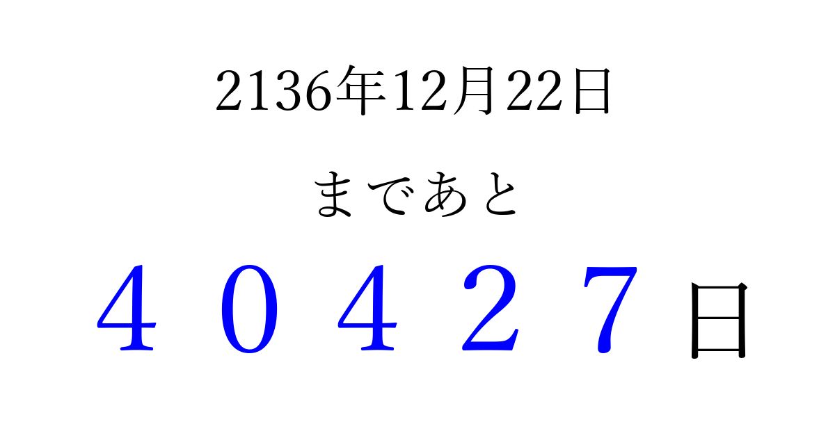 2136年12月22日(土)まで あと 99999 日です 追加すると、トップページからすぐ選べるようになります ※2026/04/16現在の結果です。 最新の状態に更新する ↓シェアして、タイムライン上にカウントダウンを表示しよう!↓ 📤 この結果を共有する Tweet シェア Threads Bluesky 別の日付でカウントダウン 2136年12月のカレンダー このページをブックマークに追加すると、いつでもカウントダウンを確認できます。 (PC: Ctrl+D / Mac: ⌘+D) hitome-notes.comでは以下のページも運営しています。 指定日と期間から日付を計算 | ガチャ確率計算・シミュレーション | プライバシー・ポリシー 運営者:Avocado