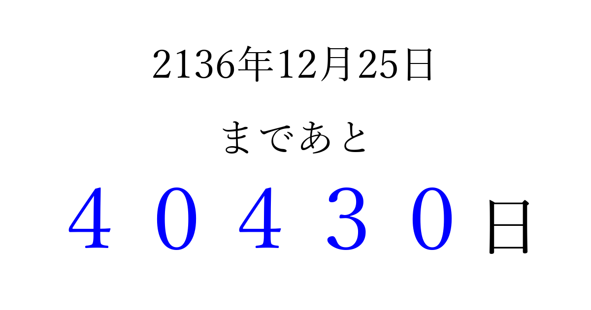 2136年12月25日(火)まで あと 99999 日です 追加すると、トップページからすぐ選べるようになります ※2026/04/16現在の結果です。 最新の状態に更新する ↓シェアして、タイムライン上にカウントダウンを表示しよう!↓ 📤 この結果を共有する Tweet シェア Threads Bluesky 別の日付でカウントダウン 2136年12月のカレンダー このページをブックマークに追加すると、いつでもカウントダウンを確認できます。 (PC: Ctrl+D / Mac: ⌘+D) hitome-notes.comでは以下のページも運営しています。 指定日と期間から日付を計算 | ガチャ確率計算・シミュレーション | プライバシー・ポリシー 運営者:Avocado
