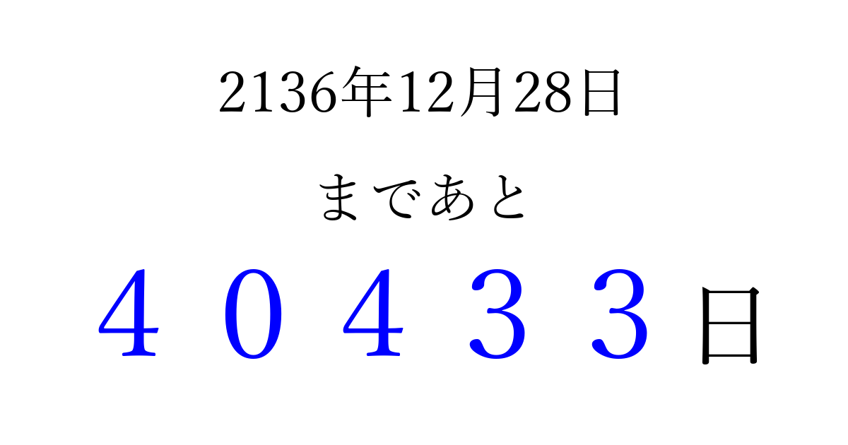 2136年12月28日(金)まで あと 99999 日です 追加すると、トップページからすぐ選べるようになります ※2026/04/16現在の結果です。 最新の状態に更新する ↓シェアして、タイムライン上にカウントダウンを表示しよう!↓ 📤 この結果を共有する Tweet シェア Threads Bluesky 別の日付でカウントダウン 2136年12月のカレンダー このページをブックマークに追加すると、いつでもカウントダウンを確認できます。 (PC: Ctrl+D / Mac: ⌘+D) hitome-notes.comでは以下のページも運営しています。 指定日と期間から日付を計算 | ガチャ確率計算・シミュレーション | プライバシー・ポリシー 運営者:Avocado