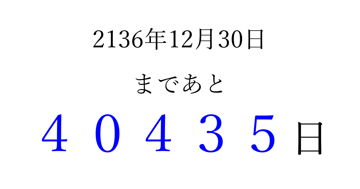 2136年12月30日(日)まで あと 99999 日です 追加すると、トップページからすぐ選べるようになります ※2026/04/16現在の結果です。 最新の状態に更新する ↓シェアして、タイムライン上にカウントダウンを表示しよう!↓ 📤 この結果を共有する Tweet シェア Threads Bluesky 別の日付でカウントダウン 2136年12月のカレンダー このページをブックマークに追加すると、いつでもカウントダウンを確認できます。 (PC: Ctrl+D / Mac: ⌘+D) hitome-notes.comでは以下のページも運営しています。 指定日と期間から日付を計算 | ガチャ確率計算・シミュレーション | プライバシー・ポリシー 運営者:Avocado