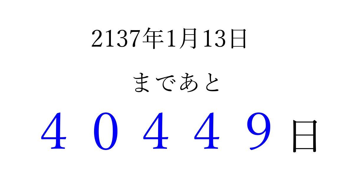 2137年1月13日(日)まで あと 99999 日です 追加すると、トップページからすぐ選べるようになります ※2026/04/16現在の結果です。 最新の状態に更新する ↓シェアして、タイムライン上にカウントダウンを表示しよう!↓ 📤 この結果を共有する Tweet シェア Threads Bluesky 別の日付でカウントダウン 2137年1月のカレンダー このページをブックマークに追加すると、いつでもカウントダウンを確認できます。 (PC: Ctrl+D / Mac: ⌘+D) hitome-notes.comでは以下のページも運営しています。 指定日と期間から日付を計算 | ガチャ確率計算・シミュレーション | プライバシー・ポリシー 運営者:Avocado