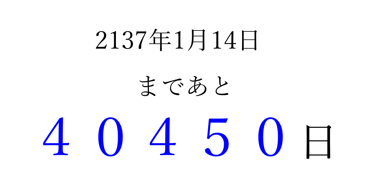 2137年1月14日(月)まで あと 99999 日です 追加すると、トップページからすぐ選べるようになります ※2026/04/16現在の結果です。 最新の状態に更新する ↓シェアして、タイムライン上にカウントダウンを表示しよう!↓ 📤 この結果を共有する Tweet シェア Threads Bluesky 別の日付でカウントダウン 2137年1月のカレンダー このページをブックマークに追加すると、いつでもカウントダウンを確認できます。 (PC: Ctrl+D / Mac: ⌘+D) hitome-notes.comでは以下のページも運営しています。 指定日と期間から日付を計算 | ガチャ確率計算・シミュレーション | プライバシー・ポリシー 運営者:Avocado