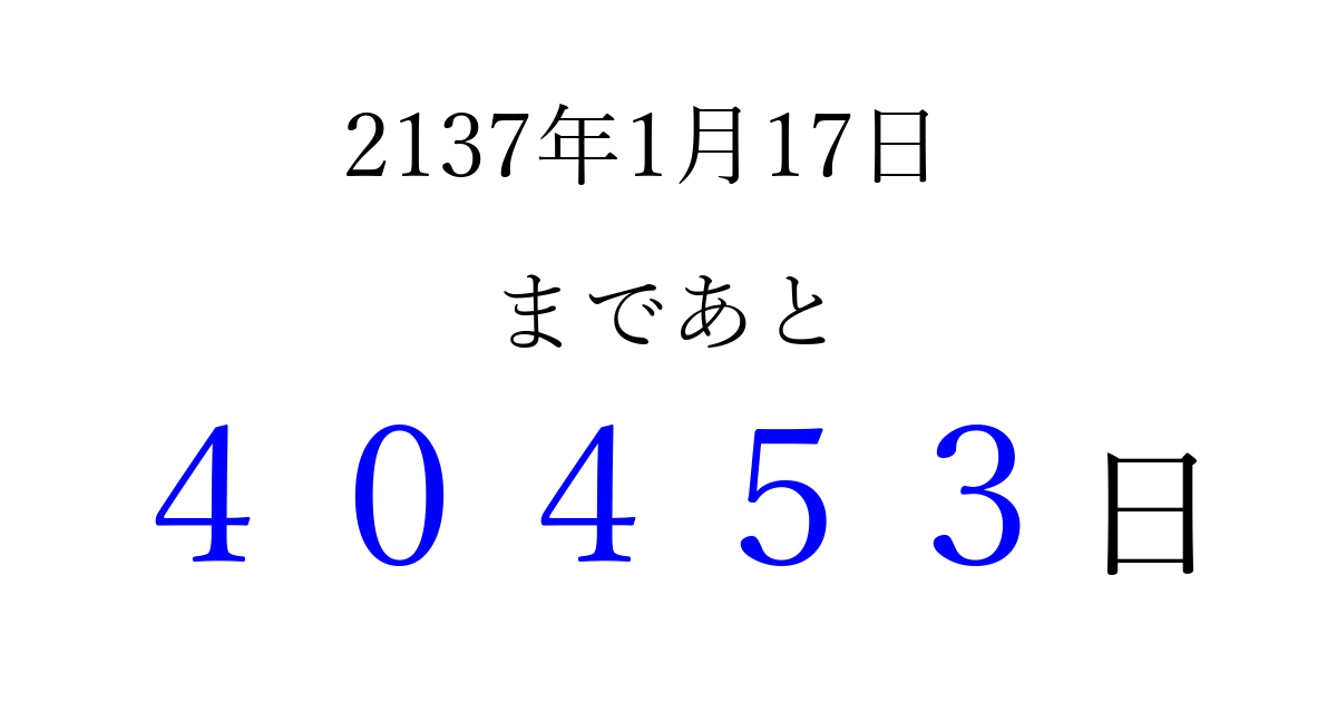 2137年1月17日(木)まで あと 99999 日です 追加すると、トップページからすぐ選べるようになります ※2026/04/16現在の結果です。 最新の状態に更新する ↓シェアして、タイムライン上にカウントダウンを表示しよう!↓ 📤 この結果を共有する Tweet シェア Threads Bluesky 別の日付でカウントダウン 2137年1月のカレンダー このページをブックマークに追加すると、いつでもカウントダウンを確認できます。 (PC: Ctrl+D / Mac: ⌘+D) hitome-notes.comでは以下のページも運営しています。 指定日と期間から日付を計算 | ガチャ確率計算・シミュレーション | プライバシー・ポリシー 運営者:Avocado