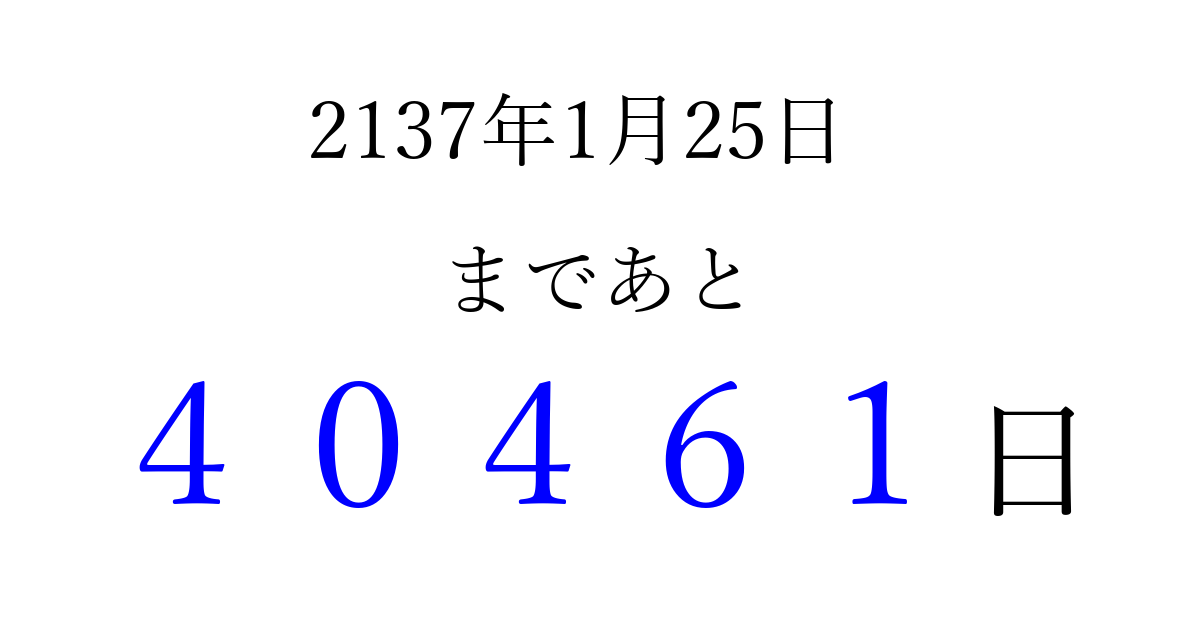 2137年1月25日(金)まで あと 99999 日です 追加すると、トップページからすぐ選べるようになります ※2026/04/16現在の結果です。 最新の状態に更新する ↓シェアして、タイムライン上にカウントダウンを表示しよう!↓ 📤 この結果を共有する Tweet シェア Threads Bluesky 別の日付でカウントダウン 2137年1月のカレンダー このページをブックマークに追加すると、いつでもカウントダウンを確認できます。 (PC: Ctrl+D / Mac: ⌘+D) hitome-notes.comでは以下のページも運営しています。 指定日と期間から日付を計算 | ガチャ確率計算・シミュレーション | プライバシー・ポリシー 運営者:Avocado