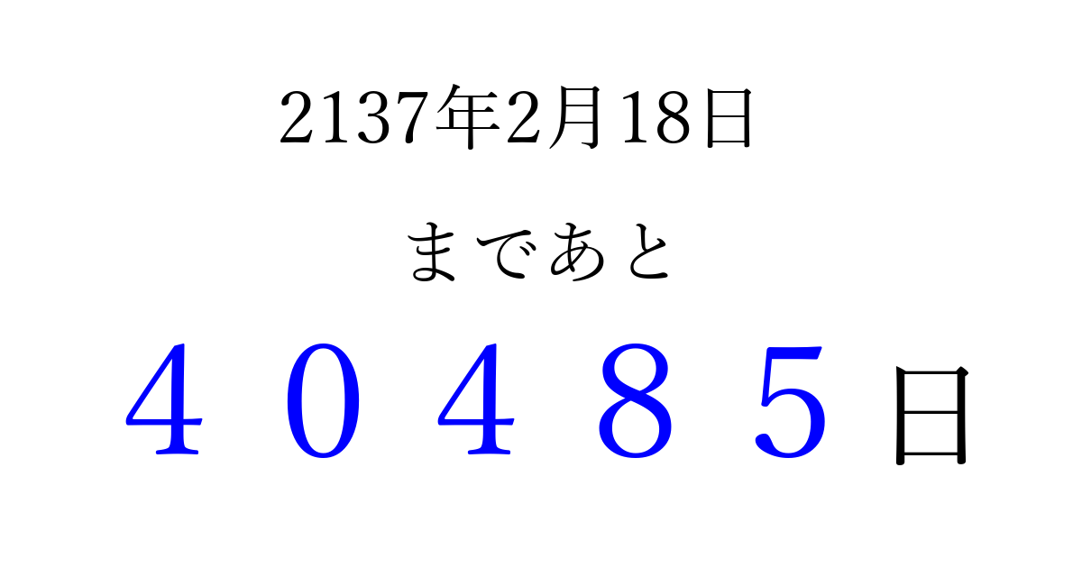 2137年2月18日(月)まで あと 99999 日です 追加すると、トップページからすぐ選べるようになります ※2026/04/16現在の結果です。 最新の状態に更新する ↓シェアして、タイムライン上にカウントダウンを表示しよう!↓ 📤 この結果を共有する Tweet シェア Threads Bluesky 別の日付でカウントダウン 2137年2月のカレンダー このページをブックマークに追加すると、いつでもカウントダウンを確認できます。 (PC: Ctrl+D / Mac: ⌘+D) hitome-notes.comでは以下のページも運営しています。 指定日と期間から日付を計算 | ガチャ確率計算・シミュレーション | プライバシー・ポリシー 運営者:Avocado