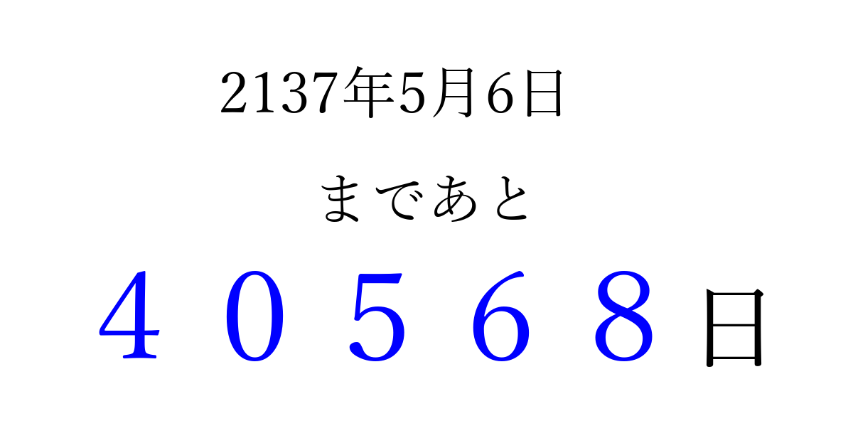 2137年5月6日(月)まで あと 99999 日です 追加すると、トップページからすぐ選べるようになります ※2026/04/10現在の結果です。 最新の状態に更新する ↓シェアして、タイムライン上にカウントダウンを表示しよう!↓ 📤 この結果を共有する Tweet シェア Threads Bluesky 別の日付でカウントダウン 2137年5月のカレンダー このページをブックマークに追加すると、いつでもカウントダウンを確認できます。 (PC: Ctrl+D / Mac: ⌘+D) hitome-notes.comでは以下のページも運営しています。 指定日と期間から日付を計算 | ガチャ確率計算・シミュレーション | プライバシー・ポリシー 運営者:Avocado