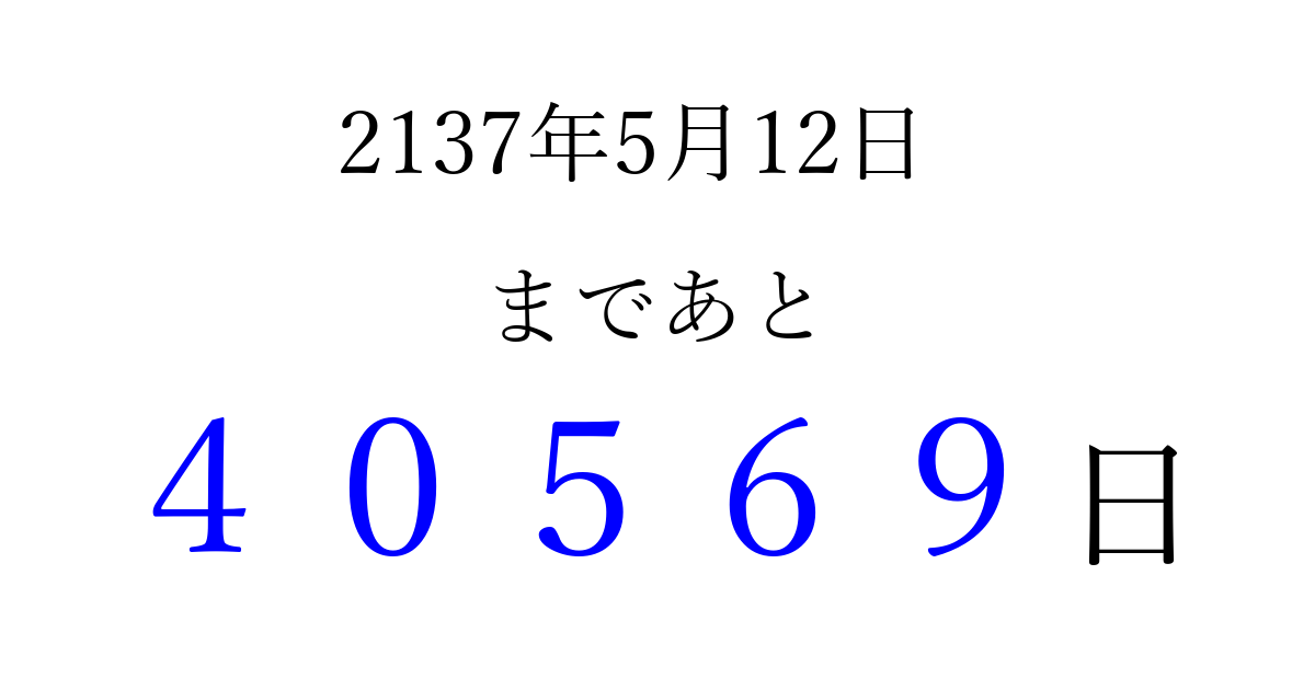2137年5月12日(日)まで あと 99999 日です 追加すると、トップページからすぐ選べるようになります ※2026/04/15現在の結果です。 最新の状態に更新する ↓シェアして、タイムライン上にカウントダウンを表示しよう!↓ 📤 この結果を共有する Tweet シェア Threads Bluesky 別の日付でカウントダウン 2137年5月のカレンダー このページをブックマークに追加すると、いつでもカウントダウンを確認できます。 (PC: Ctrl+D / Mac: ⌘+D) hitome-notes.comでは以下のページも運営しています。 指定日と期間から日付を計算 | ガチャ確率計算・シミュレーション | プライバシー・ポリシー 運営者:Avocado