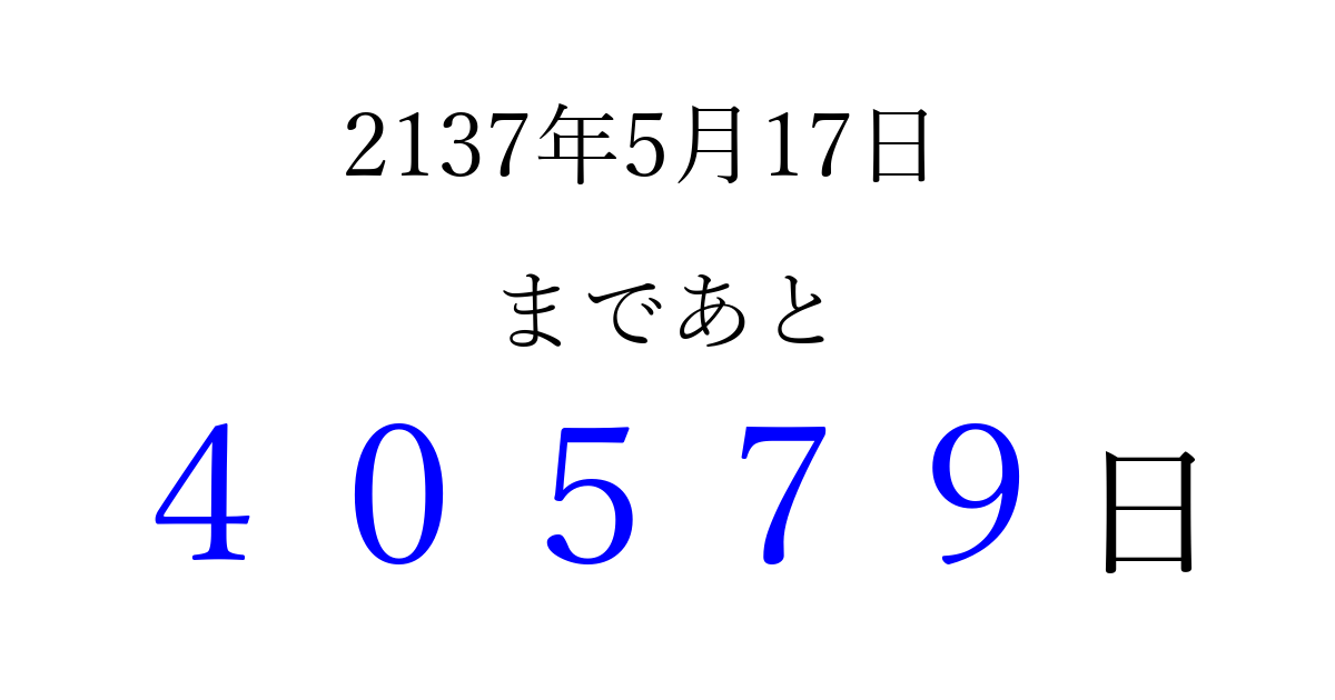 2137年5月17日(金)まで あと 99999 日です 追加すると、トップページからすぐ選べるようになります ※2026/04/10現在の結果です。 最新の状態に更新する ↓シェアして、タイムライン上にカウントダウンを表示しよう!↓ 📤 この結果を共有する Tweet シェア Threads Bluesky 別の日付でカウントダウン 2137年5月のカレンダー このページをブックマークに追加すると、いつでもカウントダウンを確認できます。 (PC: Ctrl+D / Mac: ⌘+D) hitome-notes.comでは以下のページも運営しています。 指定日と期間から日付を計算 | ガチャ確率計算・シミュレーション | プライバシー・ポリシー 運営者:Avocado