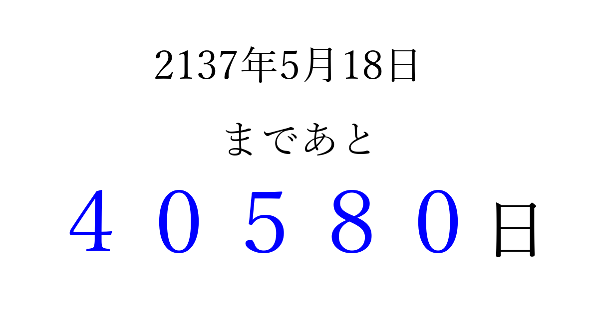 2137年5月18日(土)まで あと 99999 日です 追加すると、トップページからすぐ選べるようになります ※2026/04/10現在の結果です。 最新の状態に更新する ↓シェアして、タイムライン上にカウントダウンを表示しよう!↓ 📤 この結果を共有する Tweet シェア Threads Bluesky 別の日付でカウントダウン 2137年5月のカレンダー このページをブックマークに追加すると、いつでもカウントダウンを確認できます。 (PC: Ctrl+D / Mac: ⌘+D) hitome-notes.comでは以下のページも運営しています。 指定日と期間から日付を計算 | ガチャ確率計算・シミュレーション | プライバシー・ポリシー 運営者:Avocado