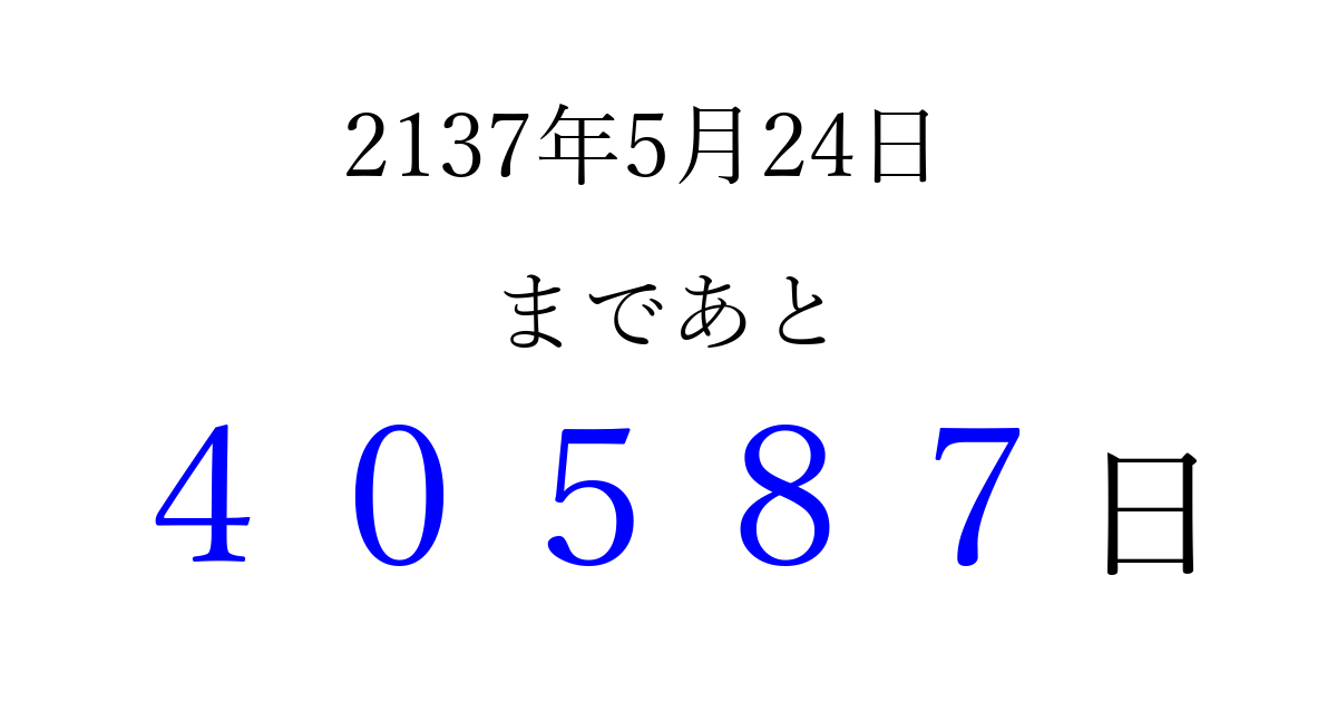 2137年5月24日(金)まで あと 99999 日です 追加すると、トップページからすぐ選べるようになります ※2026/04/09現在の結果です。 最新の状態に更新する ↓シェアして、タイムライン上にカウントダウンを表示しよう!↓ 📤 この結果を共有する Tweet シェア Threads Bluesky 別の日付でカウントダウン 2137年5月のカレンダー このページをブックマークに追加すると、いつでもカウントダウンを確認できます。 (PC: Ctrl+D / Mac: ⌘+D) hitome-notes.comでは以下のページも運営しています。 指定日と期間から日付を計算 | ガチャ確率計算・シミュレーション | プライバシー・ポリシー 運営者:Avocado